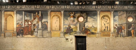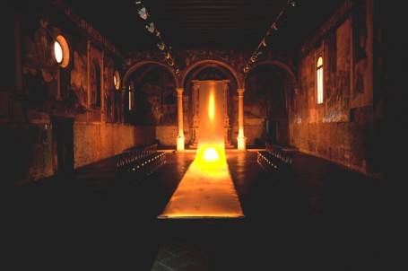 1) Con passi dorati, 2012, Oratorio di San Rocco, Padova, acrilico su raso, luci aria musica Handel, 15 x 2 m
